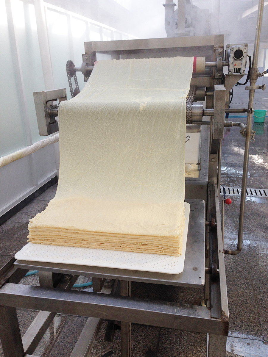 該設備由傳送皮帶、烘干機、蒸發鍋、傳送電機、冷風管、電控箱、蒸汽表等部分組成。此設備為自動流水線設備,豆漿放入蒸發鍋后,經保溫吹涼過程,將鍋表面結皮的產品送入輸送帶,自動卷起、烘干一體機,如此反復,至將豆漿全部加工完畢。